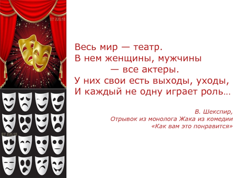 Mundus universus exercet histrioniam ( Totus mundus agit histriоnem ) - Весь мир лицедействует.